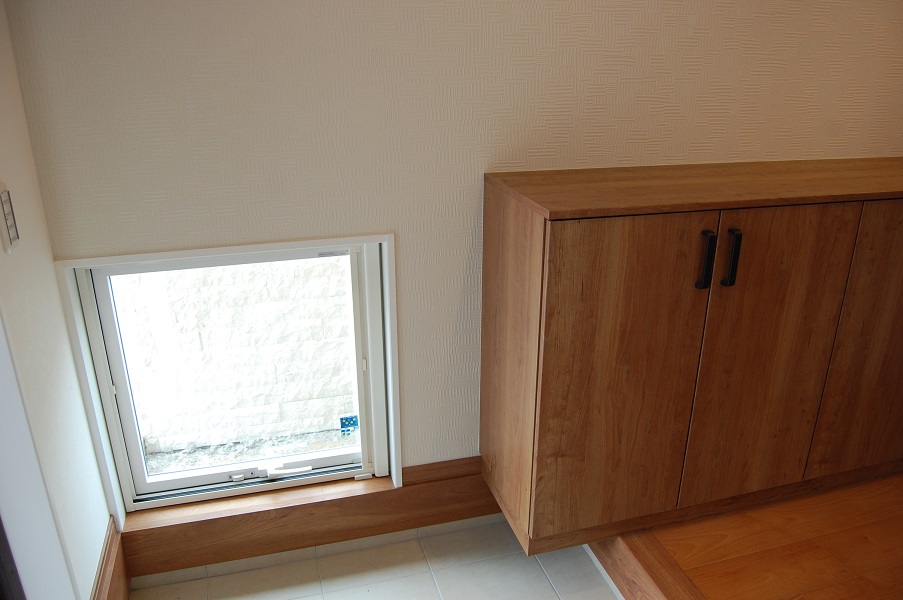 玄関入って左を向くと、採光や換気用の窓があり、いい感じです。