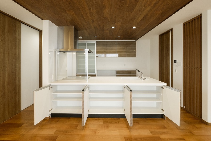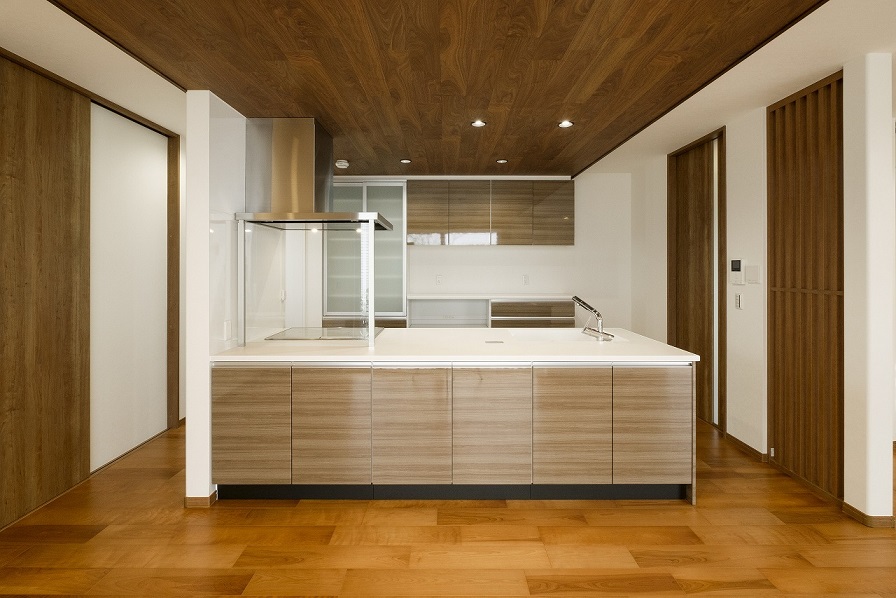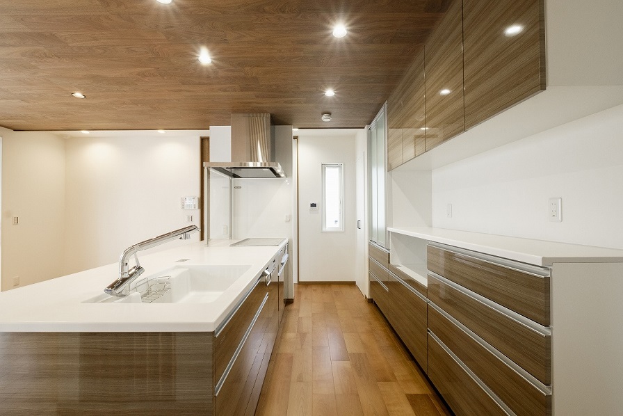 天板はフラットにしました。キッチンに奥行きがあるのでものが置きやすいし、