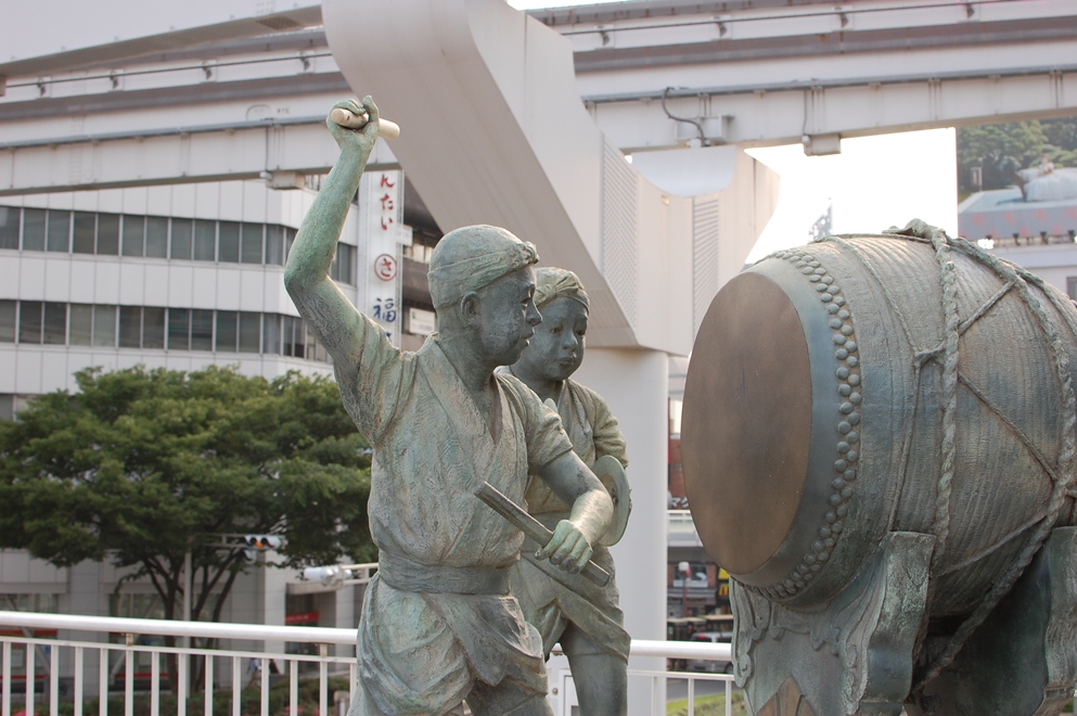 そこから小倉駅が繋がっていて、その道すがらに北九州の名物、「祇園太鼓像」がある↓