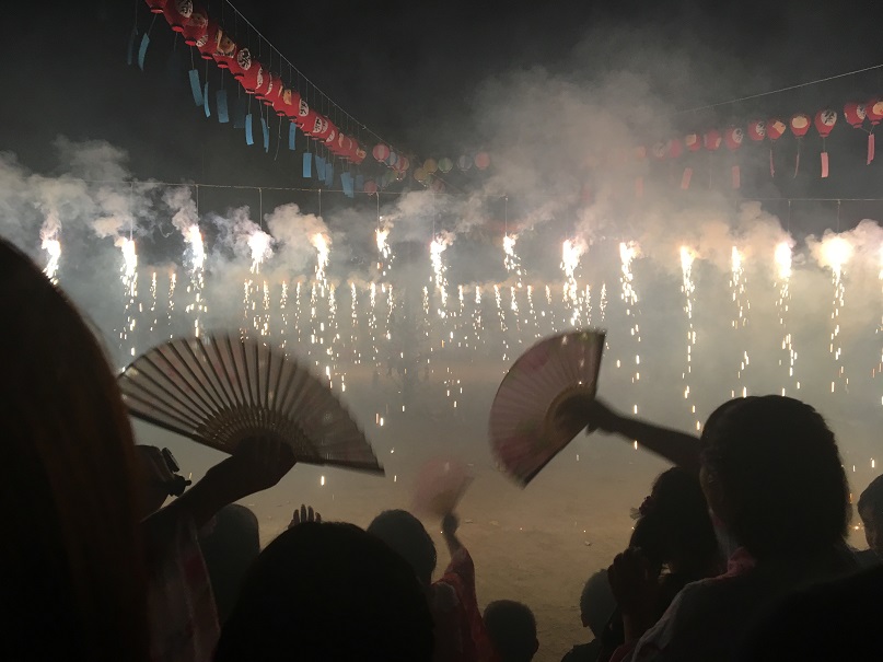 これは幼稚園の夏祭りの写真。盆踊りや花火。