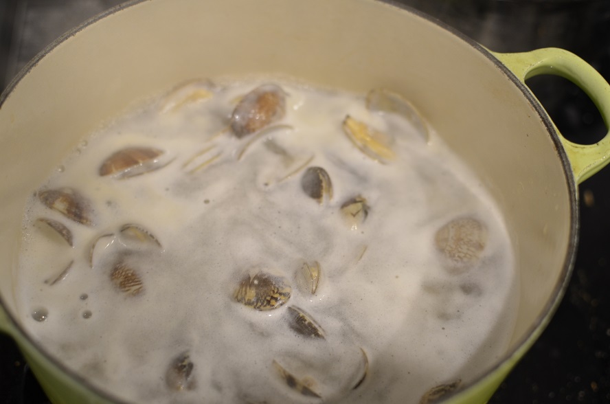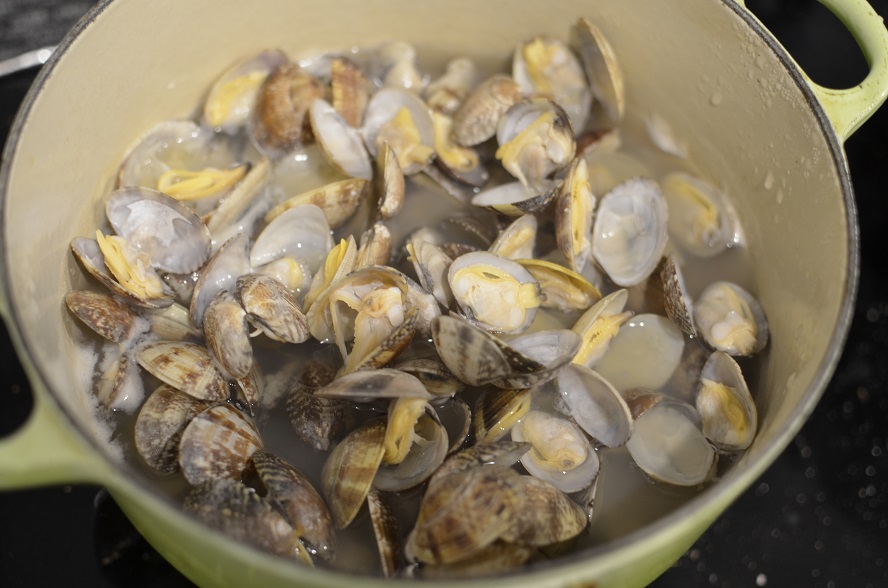 残ったアサリを鍋に入れ、水と酒(少量)も追加し、着火。