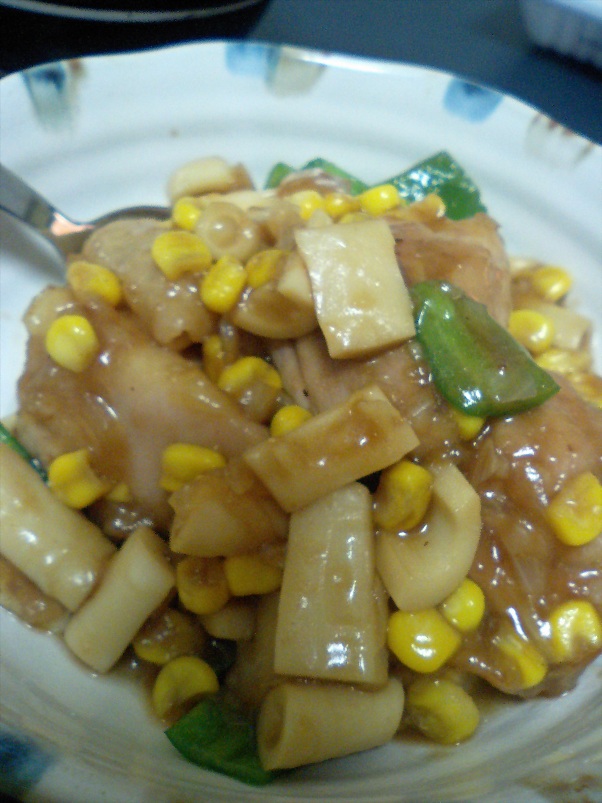 ⑤水気がある程度取れたら、たけのこ、冷凍コーン、ピーマンを入れる
