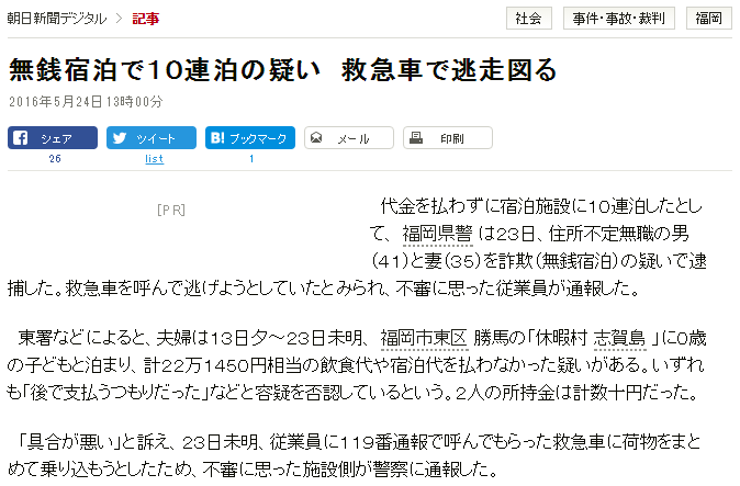 無銭宿泊、救急車で逃亡未遂のやつ。